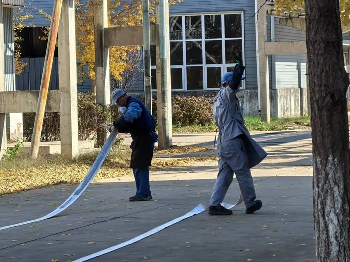 此外,在安全人員的組織下,干部職工還在消防水帶演習場所,現場連接消防水帶,實際演習了用消防水帶滅火的過程。